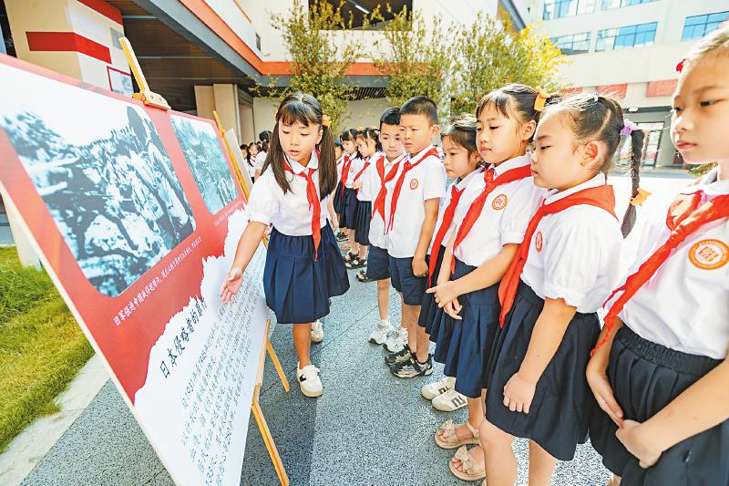 9月1日,遂宁市河东新区朝阳路小学校“开学第一课”上,学生们在观看抗战历史故事展板。 吴奉家 摄(C视觉)
