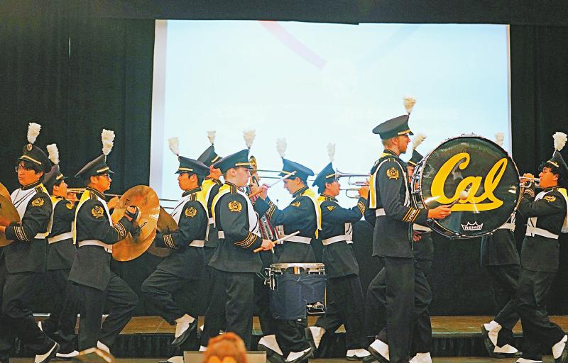 8月30日,美国“大黄蜂号”航空母舰博物馆、海外抗日战争纪念馆等机构在旧金山湾区共同举办中国人民抗日战争暨世界反法西斯战争胜利80周年纪念活动。图为当天的活动上,美国加州大学伯克利分校行进乐队演奏《保卫黄河》等乐曲。