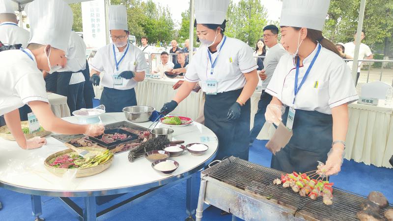 西昌市火把广场,工作人员在现场制作美食。