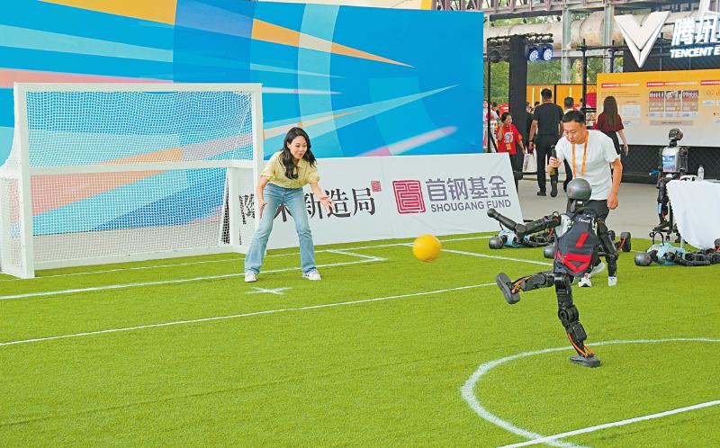 9月10日,在体育服务专题展上,参观者尝试防守机器人球员的射门。 新华社记者 丁赫 摄