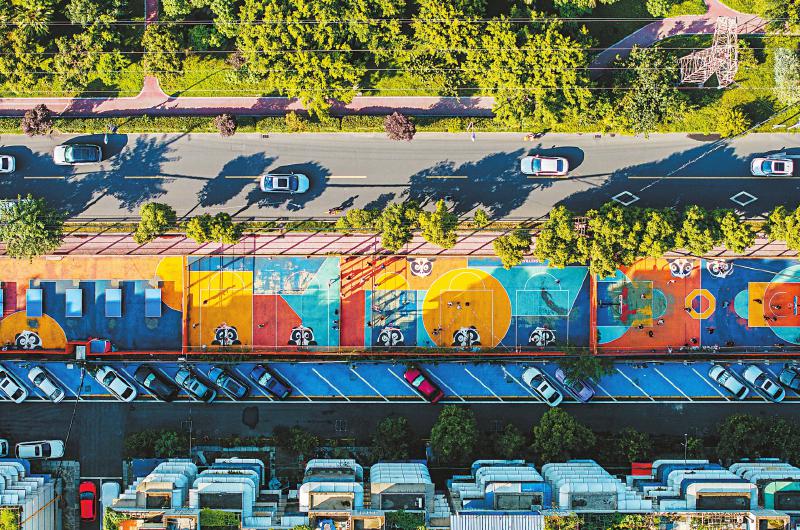 7月5日,夕阳西下,市民在成都市成华区府青路街道的一小区运动场打篮球。