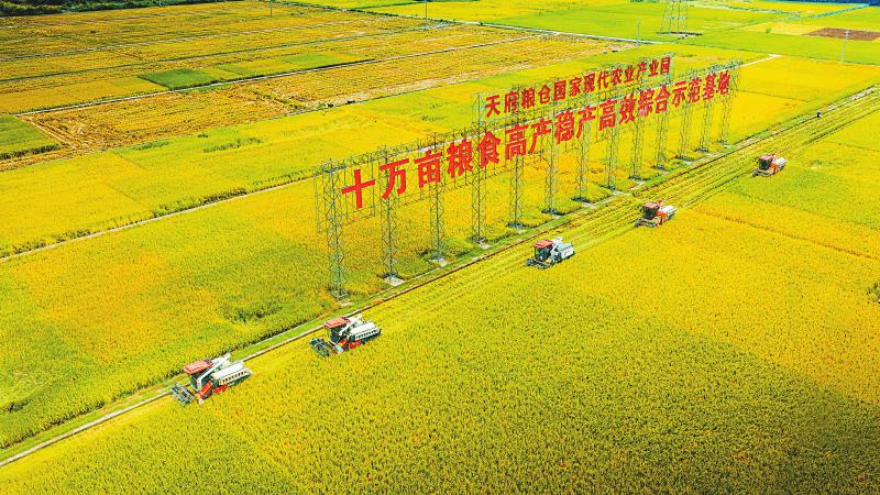 9月14日,在位于成都崇州市的天府粮仓国家现代农业产业园,32万亩水稻迎来丰收季,收割机联合作业,正式拉开今秋水稻收割帷幕。 李旭 摄(C视觉)