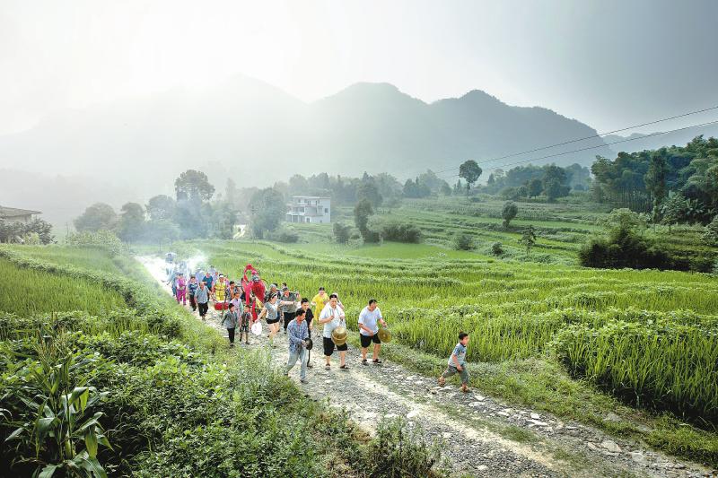 新戏台落成后的踩台仪式,戏班子敲锣打鼓接“灵官”镇台(2014年7月,泸州市合江县)。刘莉 摄