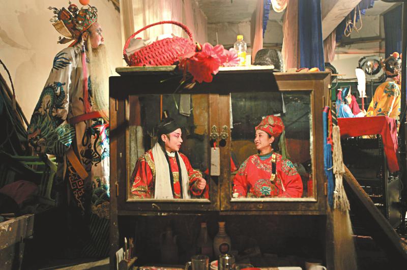 民间戏班演员在幕后商量演出的剧情细节(2012年2月,内江市东兴区)。刘莉 摄
