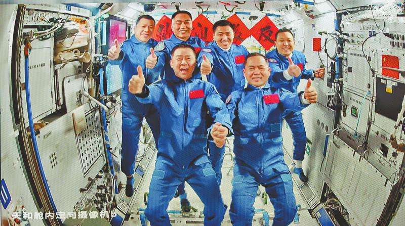 神舟二十号航天员乘组和神舟二十一号航天员乘组会师后拍摄“全家福”照片的实时画面。新华社记者 金立旺 摄