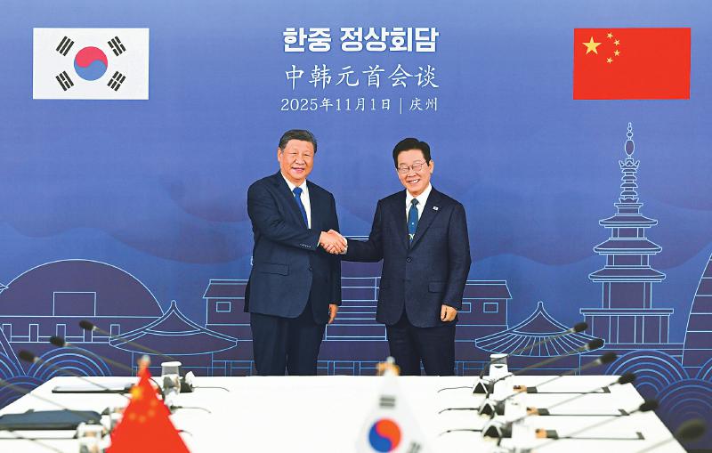 当地时间11月1日下午,韩国总统李在明同中国国家主席习近平在庆州博物馆举行会谈。新华社记者 申宏 摄