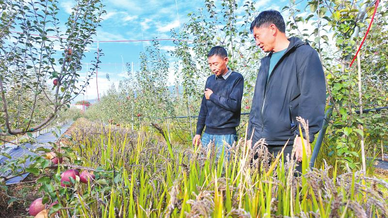 谢玉国(右)在打柴坡村查看旱稻种植情况。
