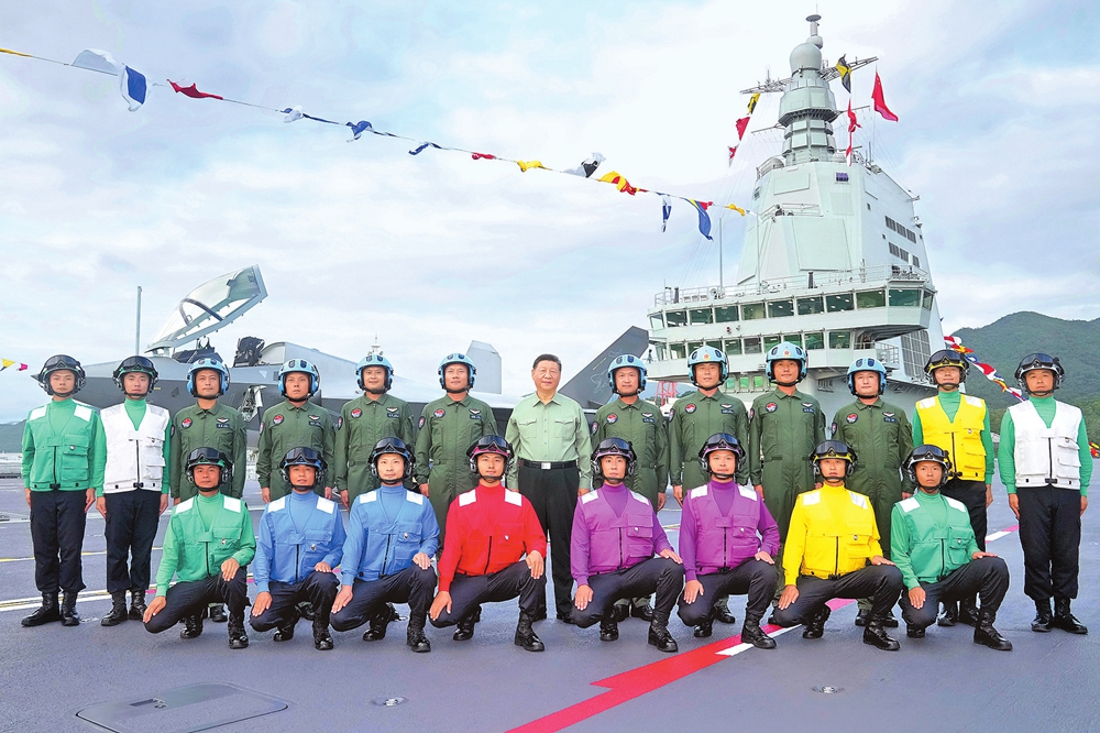 11月5日,我国第一艘电磁弹射型航空母舰福建舰入列授旗仪式在海南三亚某军港举行。中共中央总书记、国家主席、中央军委主席习近平出席入列授旗仪式并登舰视察。这是习近平同舰载机飞行员、航空保障人员合影留念。 新华社记者 李刚 摄