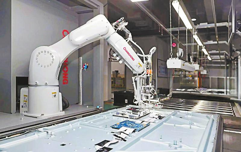 近日,由长虹自研的智能螺钉锁付机器人在长虹智慧显示工厂“上岗”。这名“新员工”负责在电视背板零部件安装环节“打螺丝”——用自带的“眼睛”识别电视背板螺孔位置并快速建模,前后不到3秒,便能完成螺钉锁付工作。据悉,该机器人锁付正确率达99.9%,可实现0.01毫米级紧固精度,螺钉紧固环节效率提升40%。四川日报全媒体记者 文露敏/文 长虹供图