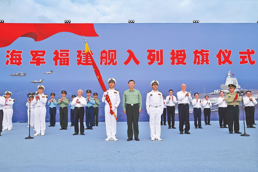 11月5日,我国第一艘电磁弹射型航空母舰福建舰入列授旗仪式在海南三亚某军港举行。中共中央总书记、国家主席、中央军委主席习近平出席入列授旗仪式并登舰视察。这是习近平向福建舰舰长、政治委员授予军旗。 新华社记者 李刚 摄