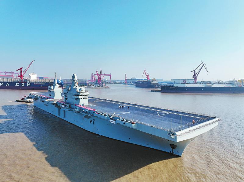 新华社上海11月14日电(张皓凝 张懋瑄)14日9时许,我国076两栖攻击舰首舰四川舰从上海沪东中华造船厂码头解缆启航,赴相关海域开展首次航行试验任务(如图)。
