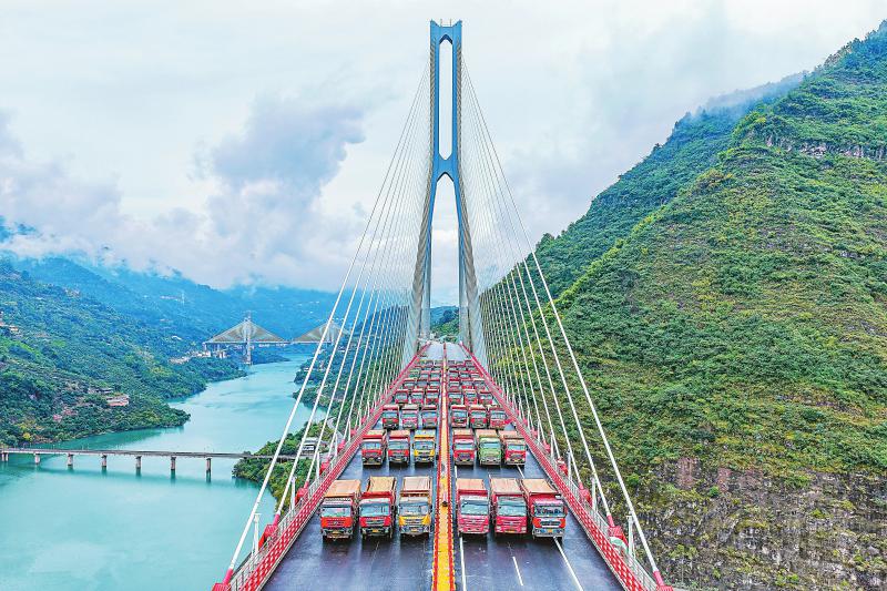 11月14日,宜宾市屏山县新市镇,宜攀高速(宜宾至攀枝花)重要控制性工程——新市金沙江特大桥顺利完成通车前荷载试验,标志着大桥主体结构已具备通车条件。试验中,48辆满载重卡静置、行进,模拟极端荷载状态,进行多种振动测试,全面检验桥梁承载力与动力特性。数据显示,大桥在各工况下受力明确、线形平顺、索力稳定,各项指标均优于设计标准,为大桥如期安全通车提供了关键的科学依据。 张元戎 摄(C视觉)