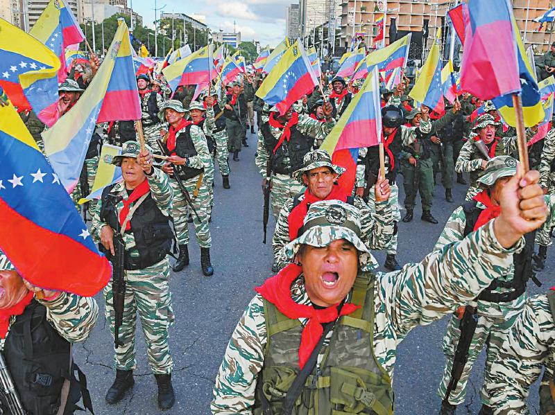 日前,在委内瑞拉首都加拉加斯,民兵组织成员挥舞国旗游行,抗议美国军事威胁委内瑞拉。 新华社发