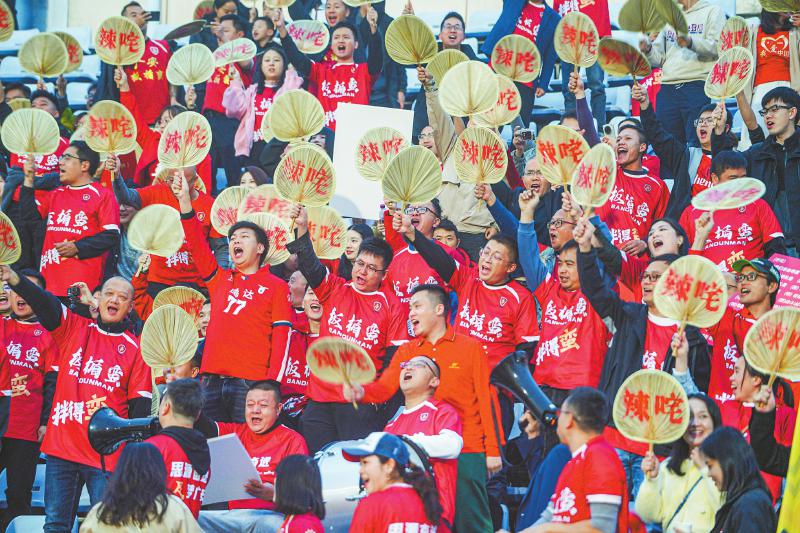 10月26日,广安板楯蛮队的球迷手持写有“辣咤”的蒲扇为球队加油助威。