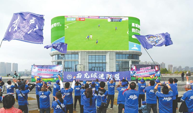 11月15日,南充丝绸源点队的球迷在远离主赛场的第二观赛现场冒雨为球队助威。