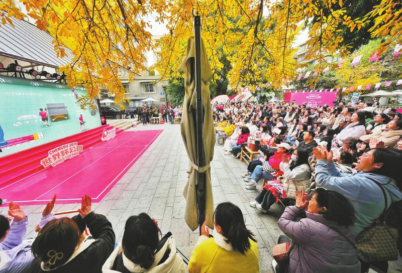 在成都市武侯区玉林街道,球迷们在露天观赛直播点观看比赛。