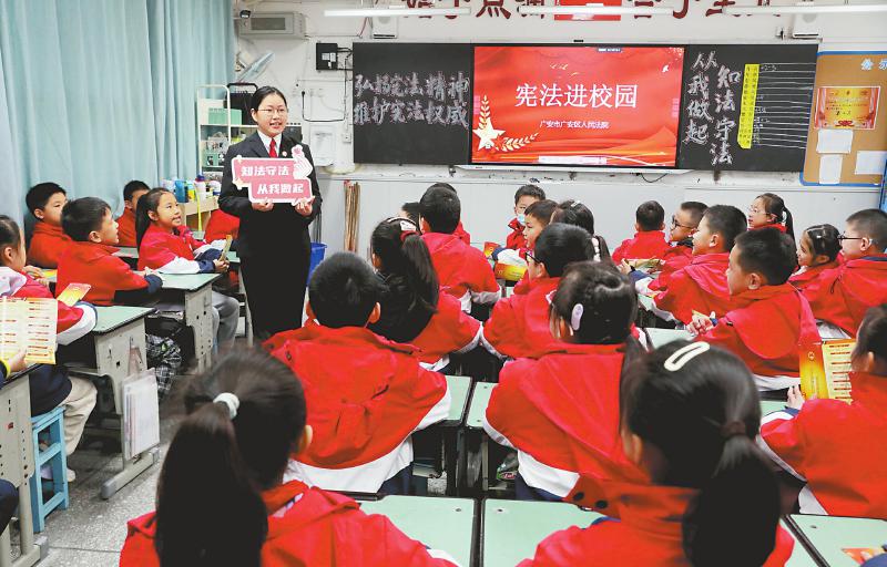 在“12·4”国家宪法日暨“宪法宣传周”来临之际,广安市广安区组织普法小分队,在广安区东方小学举行“宪法立心·法护青苗”主题教育活动,通过主题班会、展板讲解、“法治同行”大转盘问答、释疑解惑等方式,向孩子们普及宪法知识和法治常识。图为12月2日活动现场。 廖小兵 摄(C视觉)