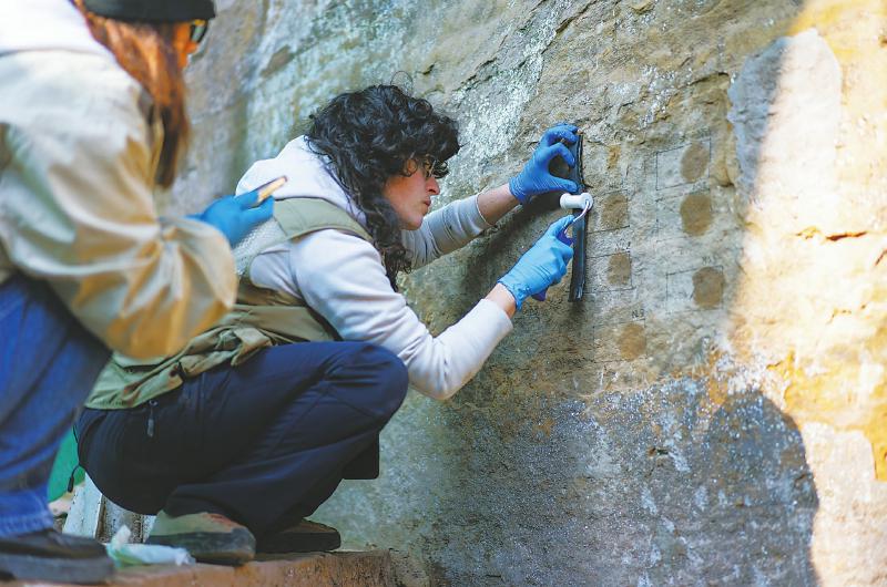 娜塔莉在风化崖壁上采样。