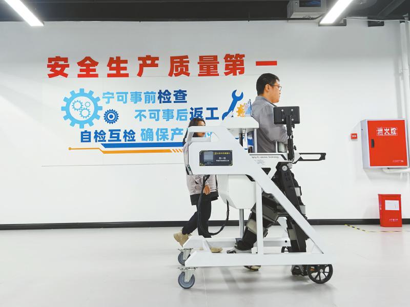 工人在测评调试外骨骼机器人。