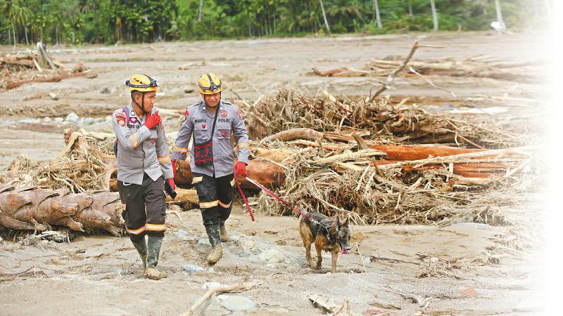 12月2日,在印度尼西亚北苏门答腊省,救援人员带着搜救犬搜寻失踪者。 新华社/美联