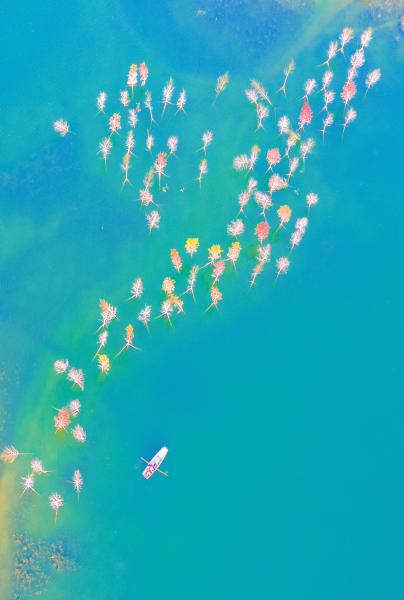 11月9日,小船驶过广安华蓥市天池湖的水上彩林。