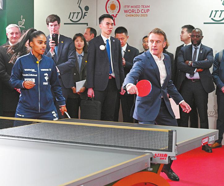 12月5日,法国总统马克龙到访四川省体育馆,看望参加2025年国际乒联混合团体世界杯的中法两国乒乓球运动员和教练员,并搭档法国队球员与中国队球员同台较量。