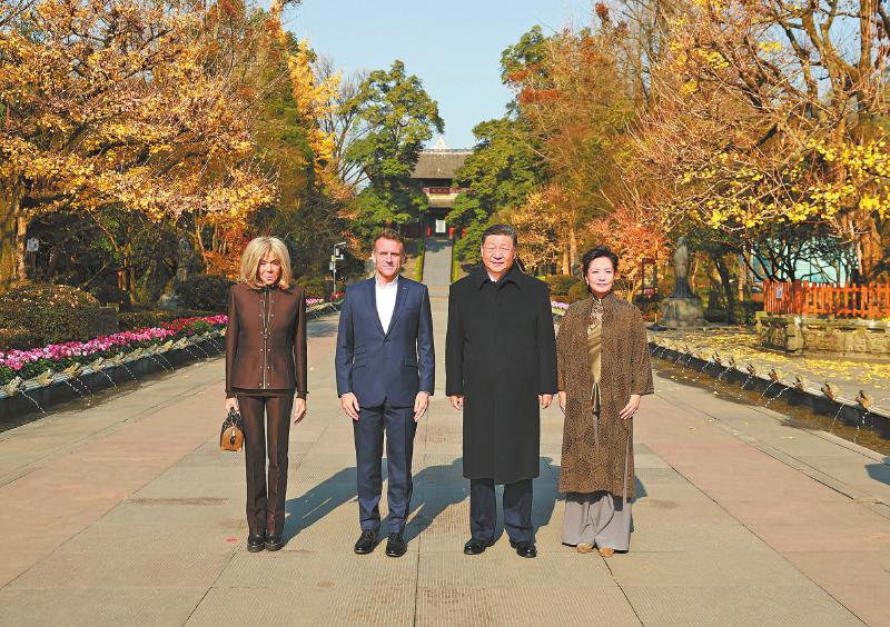 12月5日,国家主席习近平在四川省成都市都江堰同法国总统马克龙进行友好交流。这是习近平和夫人彭丽媛同马克龙夫妇合影。新华社记者 丁海涛 摄