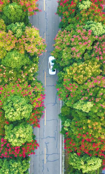 9月20日,成都崇州市道明镇重庆路竹艺村段,道路两旁的栾花绚烂如霞。