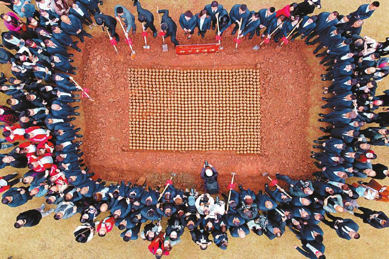 10月29日,农历九月初九,在成都市金堂县栖贤街道梨花沟村,当地群众共同扬铲种下999瓶酒来祈福。