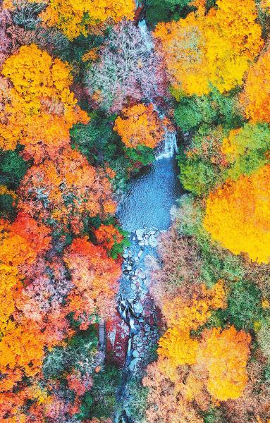 11月1日,巴中市南江县光雾山十八月潭景区,红叶簇拥着水潭,好似一幅色彩斑斓的油画。