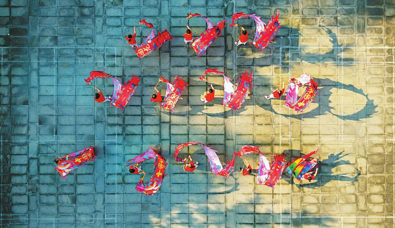 9月15日,资阳市安岳县紫竹公园文庙院内,老人们挥舞彩带龙锻炼身体,乐享晚年。