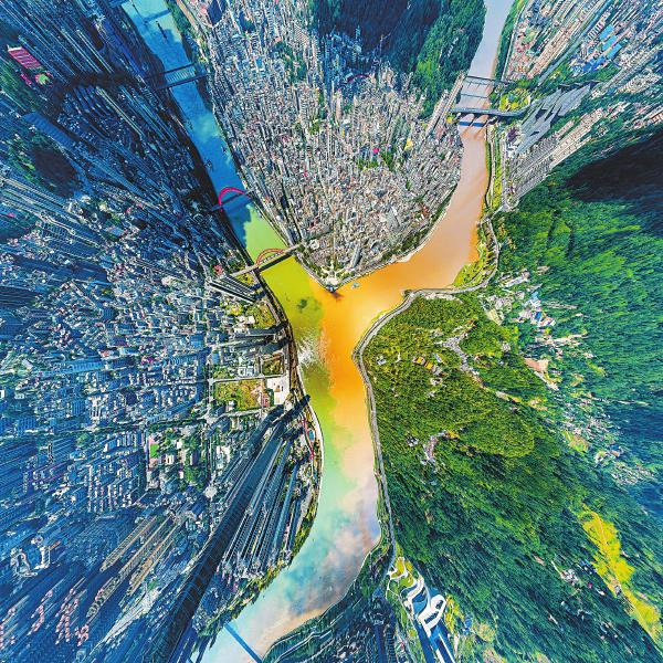 9月9日,宜宾市金沙江、岷江、长江交汇处,三江六岸城市建筑与江景、山景交相辉映。