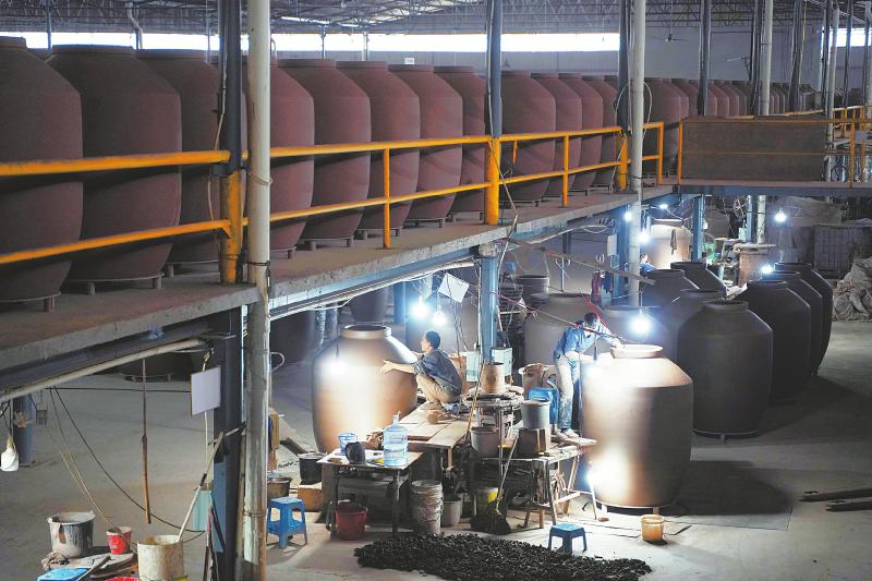 陶罐生产车间,工人正检查陶罐。唐广摄