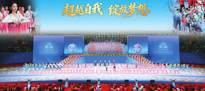中华人民共和国第十二届残疾人运动会暨第九届特殊奥林匹克运动会15日晚在深圳闭幕,这是粤港澳三地首次联合承办全国残特奥会。本届残特奥会共设46个大项,全国34个代表团的7824名运动员报名参赛,在赛场上超越自我,绽放梦想。代表团规模和大众项目报名参赛运动员数量均创新高。图为闭幕活动现场(组合图片)。新华社记者 梁旭 张楠 高咏薇 摄