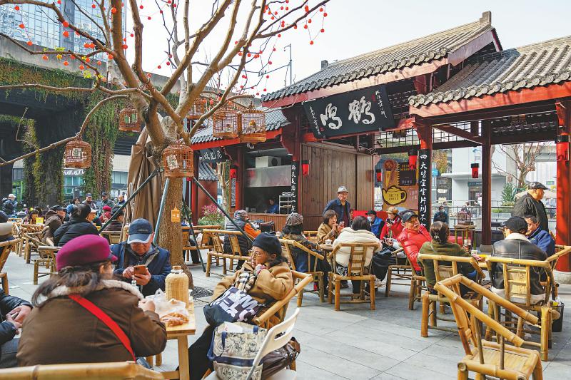 12月15日,消费者在鹤鸣茶社新店喝茶。