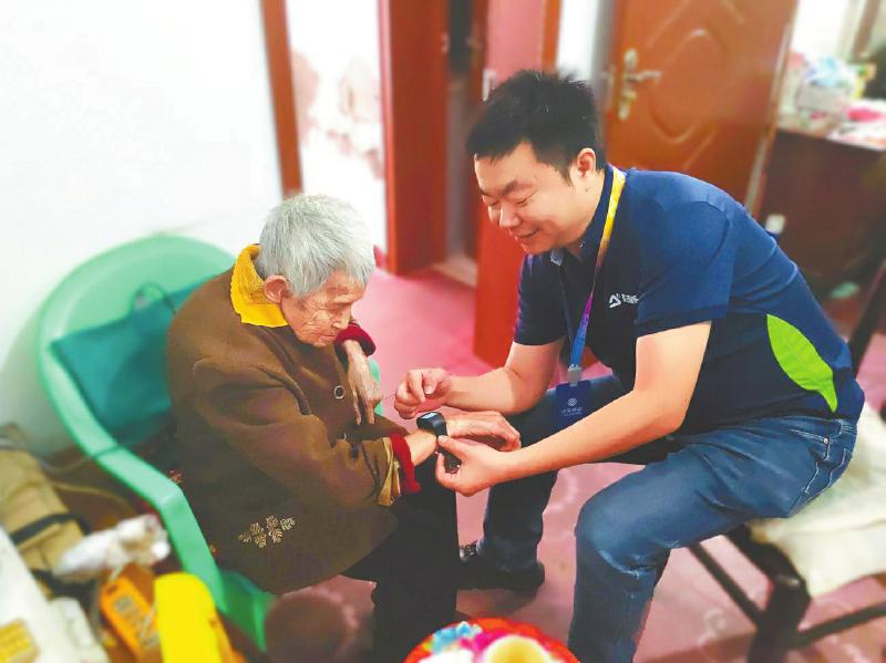 四川移动工作人员为绵阳市三台县北坝镇的一位老人装上包括智能门磁、物联网告警终端以及智能手环在内的智慧守护装备。