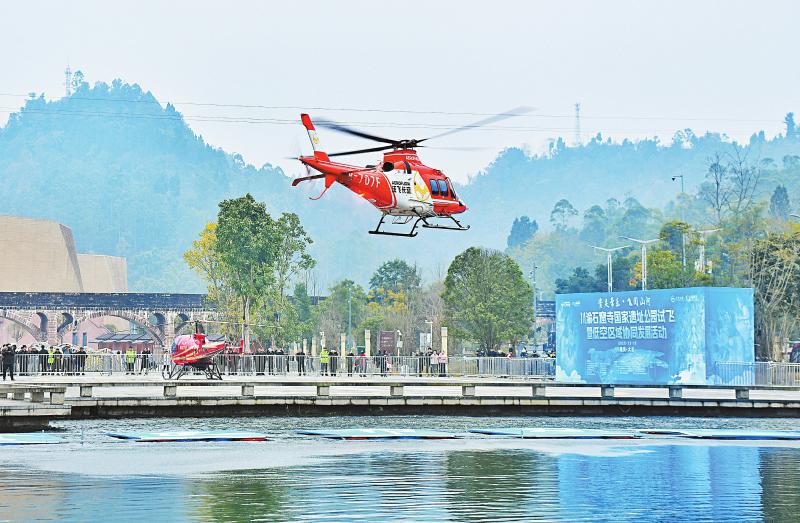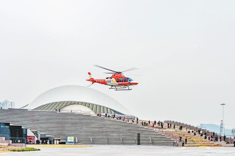 直升机从四川安岳石窟起飞。杨康忠摄(C视觉)