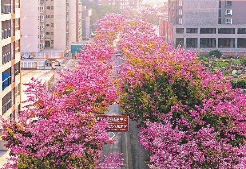 12月19日,攀枝花市仁和区土城街道上的异木棉绚烂绽放,构成一道明媚的冬日风景线。