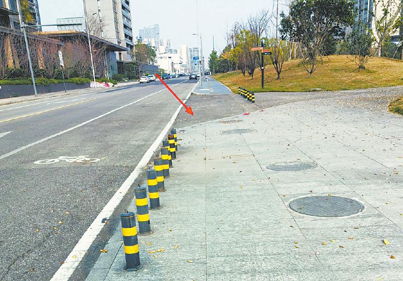 有的入口原来安装了隔离桩,但遭人为损毁严重,甚至直接被拔掉(上图箭头处)。汽车就从这个缺口,驶入本该人车分离的市政公园空地。