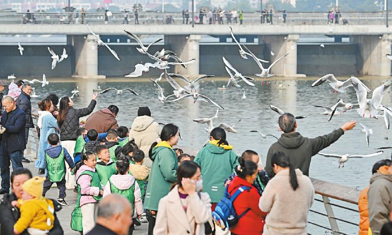 12月18日,在德阳市区的旌湖畔,市民与远道而来的红嘴鸥和谐互动,冬季观鸟已成为德阳一张亮丽的城市名片。