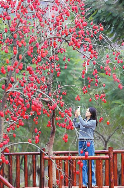 12月21日,在乐山市五通桥区汤家坝村,火红的柿子挂满枝头,游客穿梭林间拍照游玩,分享丰收喜悦。