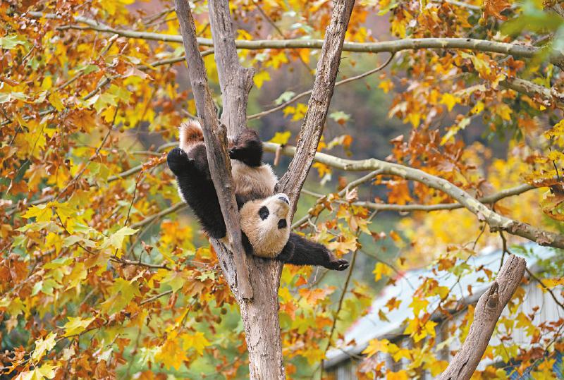12月1日,中国大熊猫保护研究中心卧龙神树坪基地的大熊猫四仰八叉地躺在树杈上,享受冬日阳光。在四川,美景加上大熊猫,就是最美的风景之一。