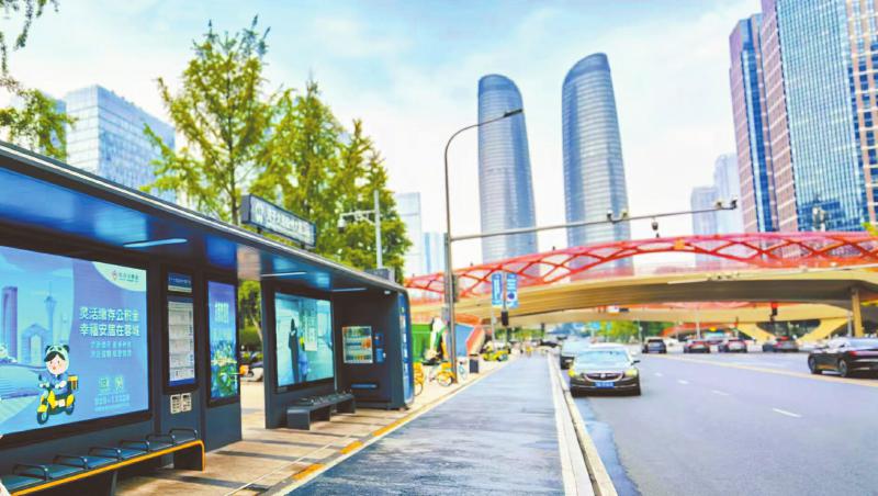 公交站台处的“灵活缴存公积金 幸福安居在蓉城”宣传展牌。
