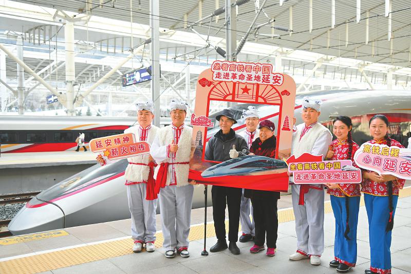 革命老区延安迈入“高铁时代” 12月26日,乘坐西延高铁首发列车的乘客与演员在延安站站台合影留念。 新华社记者 张博文 摄