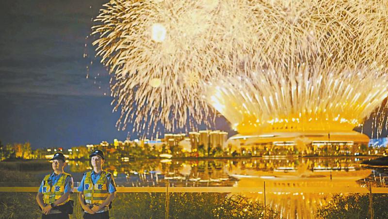 在东安湖体育公园值勤的民警。(视频截图)