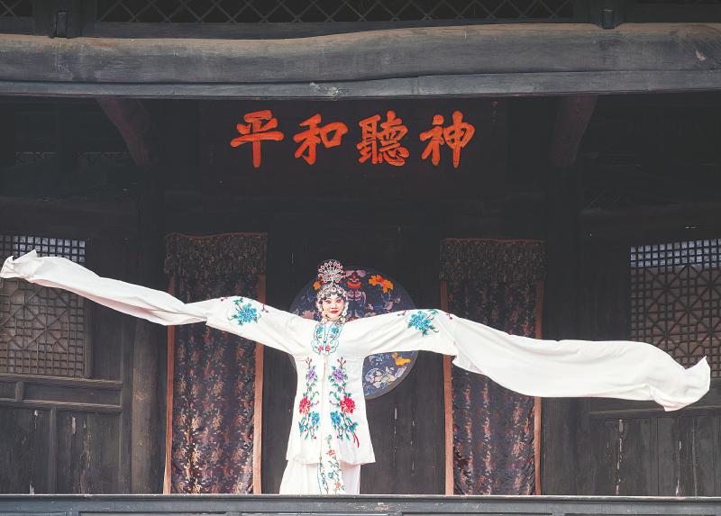 1月10日,在乐山市犍为县罗城古镇,犍为县启明星艺术团演员正在表演水袖舞。 王治 摄(C视觉)