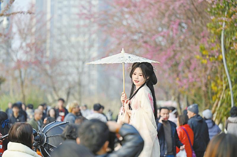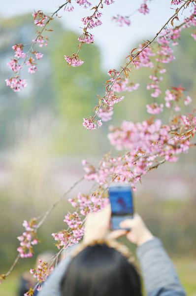 连日来,成都市青龙湖湿地公园内冬樱花盛放,吸引众多市民前往观赏打卡。图为1月12日,游客在青龙湖湿地公园拍摄樱花。四川日报全媒体记者 杨树 摄