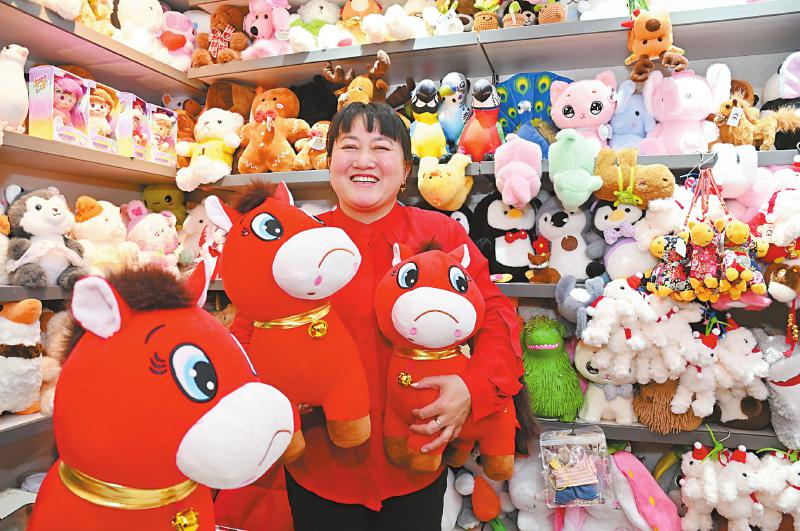 1月12日,市场经营户展示“哭哭马”公仔玩具。
