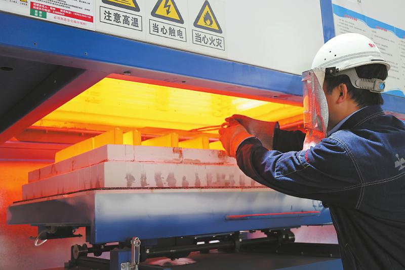 实验员廖家龙将料片置于快速升降炉内开展奥氏体化热处理。韩嘉伟 摄