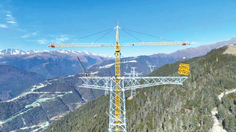 在阿坝—成都东1000千伏特高压交流输变电工程1标段现场,作业人员开展组塔作业。谢春艳 摄